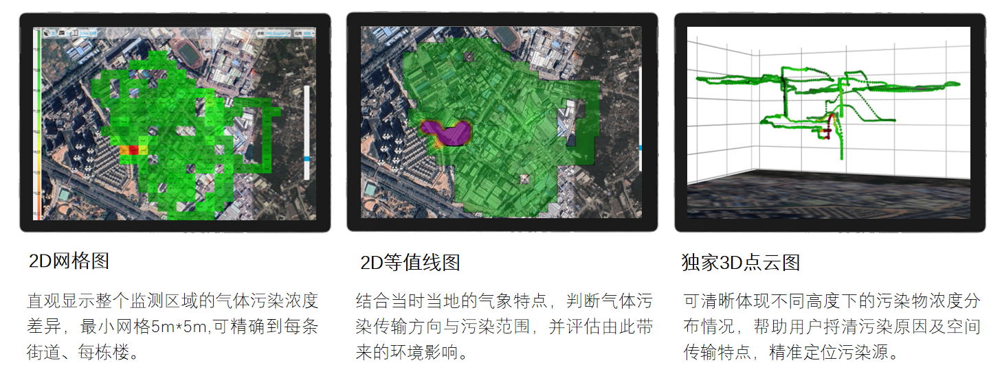3種數(shù)據(jù)可視化方式自由切換,三維污染分布情況一目了然,污染熱點(diǎn)紅色顯示,快速鎖定污染源。