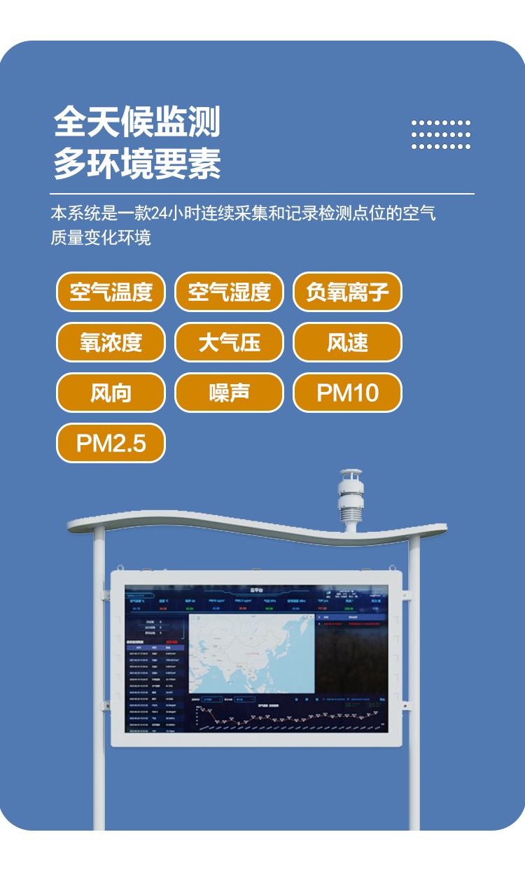 高智能負(fù)氧離子監(jiān)測站可全天候監(jiān)測空氣中負(fù)氧離子濃度,同時(shí)可根據(jù)用戶需求擴(kuò)展監(jiān)測項(xiàng)目,如:空氣溫度、空氣濕度、PM2.5、PM10、大氣壓力、氧含量、噪聲、風(fēng)速、風(fēng)向等氣象要素。傳感器一體化設(shè)計(jì),無機(jī)械位移,精度高、使用壽命長